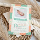 Celebrate your little one’s arrival with this personalised Photo Neutral Quilt Birth Announcement . Made with a quilt style design in sea foam green and salmon, you can add your baby’s name, birth date, weight, length, and time of birth. Customise with your favourite newborn photo to create a one-of-a-kind design that’s perfect for sharing your news with family.