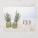 A postcard with a photograph featuring a pair of pineapples sitting on a sandy beach.