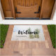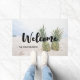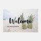 Welcome door mat with a photograph featuring a pair of pineapples sitting on a sandy beach.