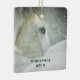 Christmas ornament with a peaceful photograph featuring a beautiful white horse. A magical winter snowfall gives the image a wonderful mystical quality.