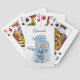 Playing cards with a cute photograph of a little snowman. Standing outside in the winter with snow falling all around. This cute little guy is dressed up in blue knitted hat and scarf.