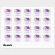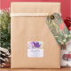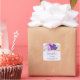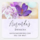 Business stickers with a lovely photograph of a dark purple crocus set inside a glass jar. A light purple blossom is present in the background.