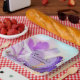 Paper plates with a lovely photograph of a dark purple crocus set inside a glass jar. A light purple blossom is present in the background.