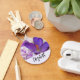 A key chain with a lovely photograph of a dark purple crocus set inside a glass jar. A light purple blossom is present in the background.