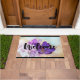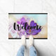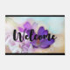Welcome doormat with a lovely photograph of a dark purple crocus set inside a glass jar. A light purple blossom is present in the background.
