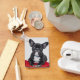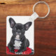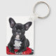 Modern photo keychain shows a black French bulldog - Louie I, sitting on a red pillow. Name is customisable.