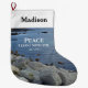 This stocking features a photo of a calm Atlantic Ocean along with a verse from the Gospel of John about peace.