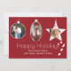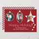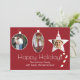 Festive red custom photo Christmas greeting card done in the flat style, with three white framed picture areas in the shape of ornaments. A fun red and white candy cane appears to hang off the Happy Holiday greeting. Personalise with your pictures and text.