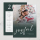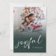 Family Photo Overlay 2026. Calendar Joyful Script Christmas Dark Green. Available digitally and printed. Simply replace the sample photo with your own and personalise with your names and year. Joyful is in a stylish playful set script in white which can be changed to another colour if you so wish. On the back is a handy 2026 calendar for your recipients.