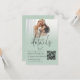 Available high quality printed to enclose with your invitations or as a convenient printable digital download. Minimalist Photo Overlay Script QR Code Wedding Sage Details Card. Invite your guests to view all the information they need such as accommodation and directions via your QR code to your wedding website. This modern sage green design with your favourite picture behind a graduated tinted layer, has an informal set typography in black for the main heading Details and the rest of the text which can you can easily personalise. Replace the sample photo with your own favourite of landscape orientation.