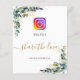 A chic white background. Decorated with green watercolored eucalyptus leaves, sprigs, greenery, faux gold leaves. With Instagram icon and the text: Photo and Share the love. Personalise and add your event #. Black and golden letters.