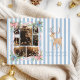 This sweet pastel holiday card features a candy cane wreath wrapped in pink and blue ribbons with watercolor florals and greenery. The soft blue striped background adds a cosy, nostalgic touch, framing your family photos beautifully. A perfect blend of festive charm and gentle cottagecore elegance.