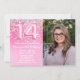 Photo Pink Glitter 14th Birthday Invitation Girly Pink Glitter 14th birthday party invitation for a 14 year old girl with modern script writing and fun foil balloons.