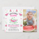 Cute girl's melon themed first birthday invitation featuring a watermelon slices, hearts, and tiny pink butterfly pattern with an arch on top. This one in a melon birthday invitation also features a photo on the front.