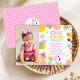 Girls one in the sun or pool party first birthday invitation featuring a pink duck float, sun, summer drinks ice-cream and more. This girl's first birthday invitation also features a photo on the front of the invitation.