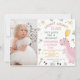 Cute photo dinosaur themed birthday party invitation featuring one large pink dinosaur, a yellow balloon, sun, foliage and trees. This stomp, chomp, roar let's party like a dinosaur birthday invitation can be used for various age but is ideal for a girl's dino themed first birthday. The photo appear on the front right hand side.