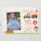 This red, orange, pink and green Autumn invitation features cute little scarecrow holding red balloon, green tractor with pumpkins and some leaves around.