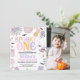Girl's Halloween themed first birthday invitation for a baby girl featuring some groovy ghosts, pumpkin, disco ball, scull, bats, cobweb and spider and mushrooms. This Halloween first birthday invitation also features a photo on the front and a wave like checkerboard pattern on the back. It's ideal for a fun October or Halloween first birthday party for a baby girl.