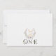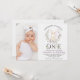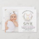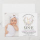 Sweet bunny themed first birthday invitation for baby girl featuring a white bunny, light purple balloon, wildflower wreath and a photo on the left hand side. This some bunny is turning one first birthday invitation also features a black word decorated with wildflowers.