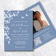 This dusty blue floral wedding invitation features cherry blossom branches on a dusty blue background. With bride and groom names in an elegant handwritten script. Your photo and a scannable qr code for your wedding website at the backside.