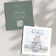 This design features a QR code RSVP online green invitation template, with simple earthy moss green colours, modern elegant guest response reply, classic photo vellum transparent overlay, with a scan scannable QR code generated, perfect for those on a budget with earthy green, a simple formal classy modern minimal, guest information details info, add your website URL link, a stylish calligraphy stationery suite