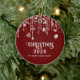 Photo red and white string lights sparkles Christmas ornament with family name for a festive Holiday party.