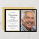 This photo retirement party invitation offers a sleek and professional layout, with a black border that is accented with a thinner gold border. Custom photo and text allows you to add a picture of the honoree and your retirement party details.