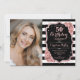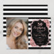 Elegant floral 50th birthday invitation with your photo. Glam black pink design with faux glitter rose gold. Features black white stripes, blush pink roses, script font and confetti. Perfect for a stylish adult bday celebration party. Personalise with your own details. Can be customised for any age! Printed Zazzle invitations or instant download digital printable template.