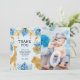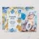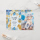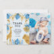 Thank guests for attending your child's first birthday party with this jungle safari themed thank you card, featuring a a collection of blue and gold faux foil jungle foliage and animals (giraffe, lion, monkey) surrounding the words "Thank You" in hand drawn typography. Easily replace the sample image with your favourite photo of the birthday boy and personalise the message. The back of the card features a blue and gold jungle foliage pattern.