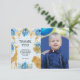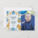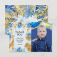 Thank guests for attending your child's second birthday party with this jungle safari themed thank you card, featuring a a collection of blue and gold faux foil jungle foliage and animals (giraffe, lion, monkey) surrounding the words "Thank You" in hand-drawn typography. Easily replace the sample image with your favourite photo of the birthday boy and personalise the message. The back of the card features a blue and gold jungle foliage pattern.