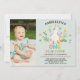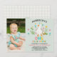 Sweet silly goose themed first birthday invitation featuring a goose, basket, colorful flowers and foliage. This one silly goose birthday invitation also features a photo on the side and some multicolored text on a sage background.
