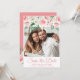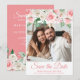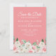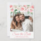 Pink peach watercolor floral photo save the date card, with a very light peri wash textured background. Customise names, dates, and information.