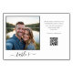 These photo table number cards with QR Code for photo sharing are perfect for your wedding reception! Simply choose a favourite photo of you to use with the table number below. This is a great way to ask guests to upload their photos of you to your wedding website. Your guests will love sharing their fabulous photos of your wedding and reception with you. It is so easy to make these cards your own. Simply select "Personalise this Template", upload your photo, type in your qr code URL, and type the table number then add to cart. Repeat for how every many tables you will be having at your reception.