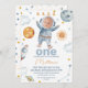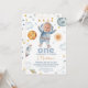 Sweet outer space or first trip around the sun first birthday invitation for a baby boy that features your little boy's photo in the space helmet. This first trip around the sun 1st birthday invitation also features, a small sun, planets, stars, spaceship and spaceman.