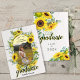 Celebrate your achievement with our "Photo Sunflower Script Graduation Announcement"! Personalise this announcement with a cherished photo and share the joy of your graduation with friends and family. The elegant sunflower design adds a touch of sophistication to your special announcement. Whether for mailing or digital sharing, this customised graduation announcement is a beautiful way to mark this important milestone and invite loved ones to join in the celebration.