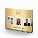 A faux gold looking background. Personalise and add business logo, 3 photos and a text on front. Black text.