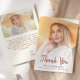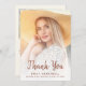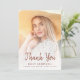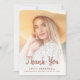 Modern graduation thank-you card featuring a custom vertical photo on the front and a horizontal photo on the reverse. The words "Thank You" appear in terracotta script, with your name and year of graduation below in sans serif font. Personalise the reverse side with a message of your choice in terracotta sans serif on a beige background, and add your signature line in handwriting script. Easily replace the sample images with your own photos. A white gradient screen helps ensure the text on the front of the card pops. Ideal for high school or college graduation.