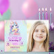 Personalized photo invite featuring a sweet unicorn illustration and pastel rainbow colors for her 7th birthday.