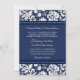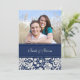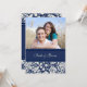 Wedding invitation custom photo cards in elegant dark navy blue and off white floral damask pattern. Customise these invitations with your wedding details and your own photo. Available in matching products for all of your wedding needs.