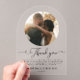 Express your gratitude with this elegant acrylic wedding thank-you card. Featuring a customisable photo section to highlight your favourite wedding moment, this design is both heartfelt and stylish. The transparent background adds a romantic touch, complemented by elegant script typography for your message of thanks. Perfect for newlyweds who want to share their appreciation with family and friends in a personal and timeless way.