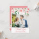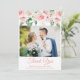 Wedding photo thank you card with pink peach floral design, pretty flowers with elegant script. Customise names, dates, and information.
