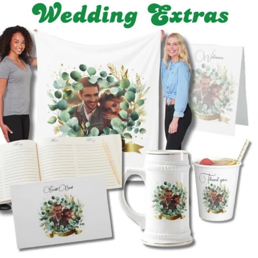 Photo and text template wedding, newlyweds, anniversary gift item with a Eucalyptus, greenery leaves, with gold accents theme.