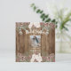 Wood fence. Watercolor White Floral & Pine Cone Bridal shower invitation. Cream background. Information on the back. Bride photo. Square.