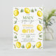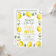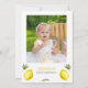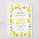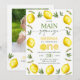 Sweet girls first birthday invitation featuring a lemon and foliage outer edge pattern and a modern calligraphy heading. This our main squeeze first birthday invitation also features a lemon slice used to spell one and a photo on the back.