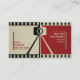 Photographer camera photography black, red, beige business cards featuring a photographer camera on its tripod ready to take photographs in black, beige, ecru positive negative vintage/retro style on red and beige background with film sprocket holes that run along the top and bottom and halftone elements. Perfect business card design for professional photographers.