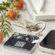 A professional photographer's custom photo black and white keychain is used as promotional swag showing the website details and QR-code. For customisation assistance or to discuss a custom design, contact https://t.me/KBMD3signs_chat.