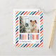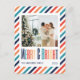 This Christmas Holiday Card features a retro colour typography text "merry & bright", the family's names, year, and photo on a retro stripes background.