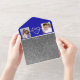 Embrace timeless sophistication with our elegant silver glitter and royal blue all-in-one wedding invitation. Featuring modern minimalist design, your custom monogram - the intertwined initials of the bride and groom within a gold rope heart - adds a personal touch. Delicately crafted calligraphy script complements the design, while three custom pictures of the happy couple grace the card, capturing your journey together. Seamlessly integrate your event details with our included website link and QR code, simplifying RSVPs and providing additional information. Celebrate love in style with this exquisite invitation suite.