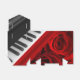 Photo of an elegant black piano with an ebony and ivory keyboard next to a photograph of a bed of red roses separated by a satin red ribbon.