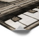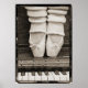A beautiful sepia toned still life photograph of ballet shoes en pointe atop an upright piano keyboard surrounded by a graphic polaroid-style border. Small size poster is 11 x 15 1/2 inches or 28 x 39 cm.